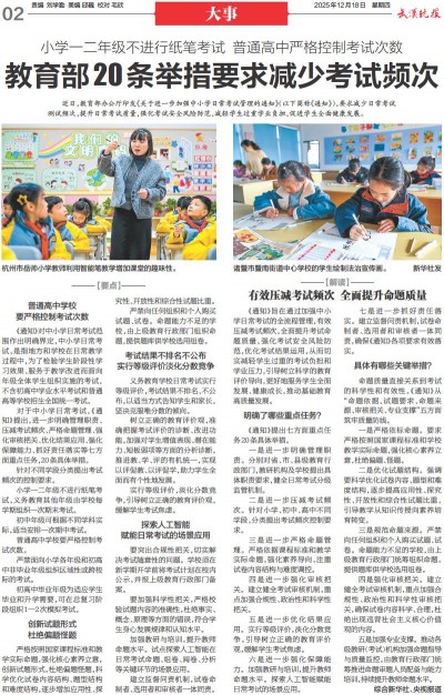 对于中小学日常考试,《通知》提出,进一步明确管理职责、压减考试频次、严格命题管理、强化审核把关、优化结果应用、强化保障能力、抓好责任落实等七方面重点任务,20条具体举措。