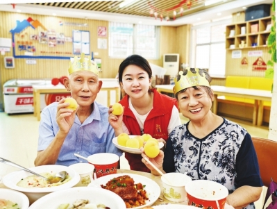 在117社区“好味到”食堂里,每个月都会选一个阳光明媚的日子,让欢快的生日歌声充满整个餐厅。这是食堂为当月过生日的老人举办的集体生日宴。82岁的张言周戴着寿星帽,对着插满蜡烛的蛋糕许下心愿:“希望咱社区食堂越办越好,大家都健康长寿!”餐桌上,摆着精心烹制的饭菜、长寿面,还有社区特意准备的低糖蛋糕。“以前一个人过生日冷冷清清,现在有这么多人一起庆祝,太开心了!”李桂花奶奶笑着说。这样的生日宴已举办了60余场,成为老人们最期待的“每月一聚”。