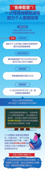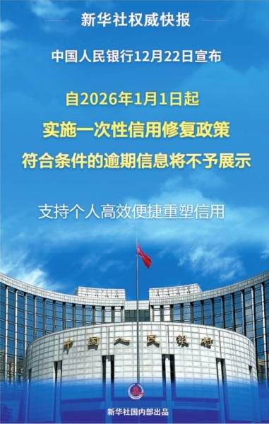 在进行必要的技术准备后,中国人民银行于22日明确发布一次性信用修复政策有关安排。自2026年1月1日起征信中心将根据不同还款情形完成自动调整,相关逾期记录不再在个人信用报告中展示。