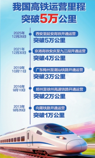 5万公里,是成果也是新起点。随着高铁网络持续完善,中国高铁正从“规模领先”向“质量引领”加速迈进。钢铁长龙飞驰,一个更加高效流动、充满活力的中国,正奔向更加广阔的未来。