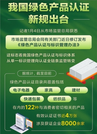 又讯 记者4日从市场监管总局获悉,市场监管总局会同有关部门近日修订发布《绿色产品认证与标识管理办法》。这标志着我国绿色产品认证与标识体系从单一标识管理向认证全链条监管转变。