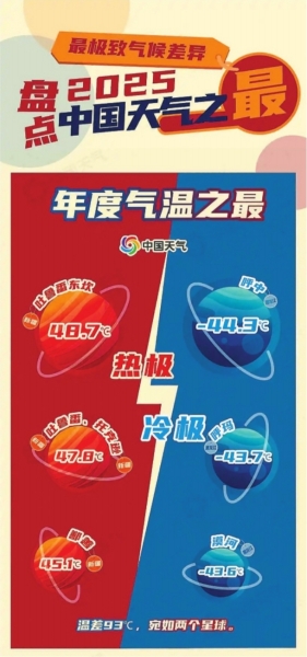 我们的脚下是一片辽阔的土地。这里背靠世界最大大陆,又濒临世界最大大洋,由此酝酿出世界上最发达的季风区域之一。这里是中国,最极致的气候差异,可能不在你熟悉的城市,而是某个小镇、小岛,甚至某个你从未听过的远方。2025年末,中国天气网盘点全国2429个国家级气象观测站的天气数据,带你探寻过去一年里那些中国天气之“最”。