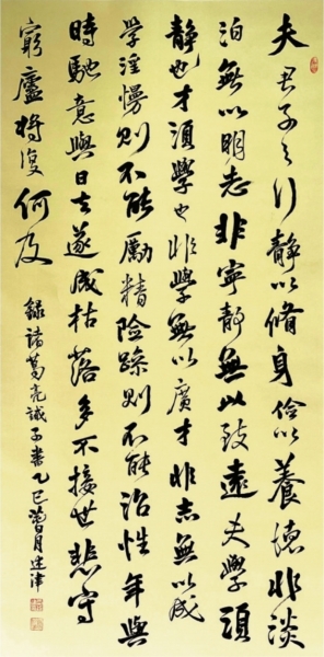 释文:夫君子之行,静以修身,俭以养德。非淡泊无以明志,非宁静无以致远。夫学须静也,才须学也,非学无以广才,非志无以成学。淫慢则不能励精,险躁则不能治性。年与时驰,意与日去,遂成枯落,多不接世,悲守穷庐,将复何及!