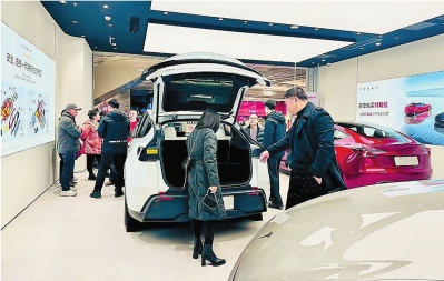 1月6日,市民在武汉武昌万象城内一家特斯拉门店看车。