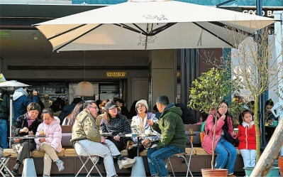 1月10日,消费者在上海徐汇区某商铺外摆区域享用甜品。