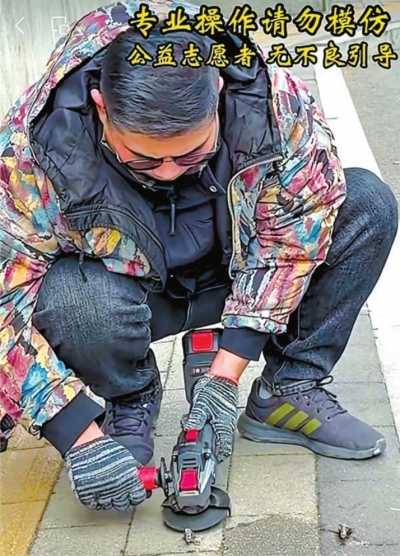 山东滕州公益人士夏天,在当地帮忙清理地钉已有两三年。他曾目睹一名外卖骑手因积水掩盖的地钉扎爆车胎,连人带车摔倒,外卖撒了一地,当时就想“应该有人去清理这些隐患”。运用角磨机等专业工具,快则一两分钟,慢则十几分钟,他就能把一颗地钉清除干净。