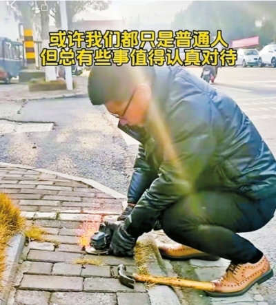 “黄山正能量小伙”街头拔钉。