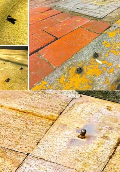 在白庙路南侧一家店铺外,4个地钉露出地面约3厘米;在文化路与文劳路交叉口西北角人行道上,有多处地钉被清理后留下的痕迹,其中1个地钉未清理,而是被砸歪,行人路过时容易被绊倒;在博颂路与文劳路之间的信息学院路东侧,人行道上至少有3个遗留的地钉,高出地面约1厘米;在文化路与东风路交叉口西南角的人行道上,有两个地钉裸露,高出路面约两厘米……