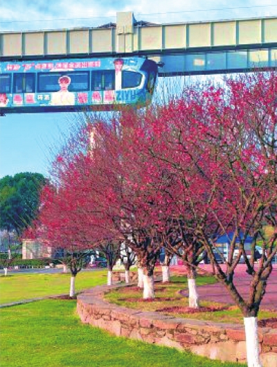 光谷西苑公园空轨与梅花同框。