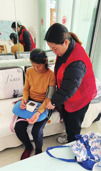 新五里社区工作人员上门为独居老人测量血压。