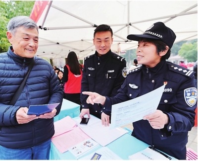民警王明华(右)向居民宣传反诈案例。