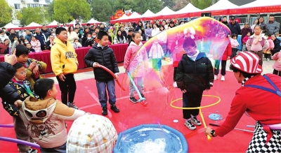 活动中,一位“小丑”演员的泡泡秀意外成为焦点,大小泡泡飞舞间,孩子们兴奋上台互动,表演瞬间化为欢乐的海洋。“小丑”演员将巨大泡泡套向孩童,笑声此起彼伏。
