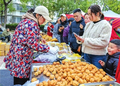 社区居民排队购买炸圆子、炸藕夹等。