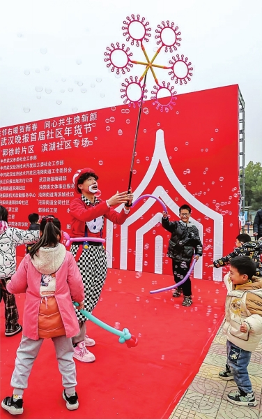 “小丑”演员弄出泡泡,年货节舞台成为孩子们欢乐的海洋。