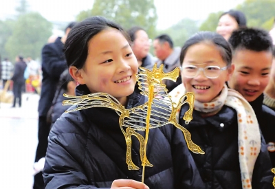 小朋友拿着糖画马真开心。