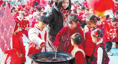 浙江湖州德清县新市镇第三幼儿园小朋友体验煮腊八粥。