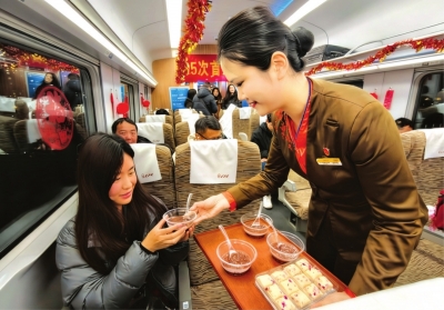 在26日深夜首趟图定列车车厢内氛围热烈,乘务人员精心准备了纪念卡片,成为旅客争相收藏、打卡的“出行纪念”。