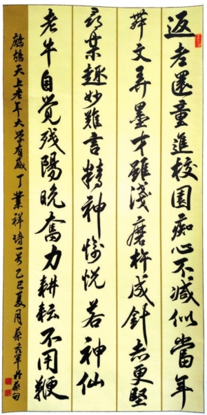 释文:返老还童进校园,痴心不减似当年。舞文弄墨才虽浅,磨杵成针志更坚。 寻乐趣,妙难言。精神愉悦若神仙。老牛自觉残阳晚,奋力耕耘不用鞭。