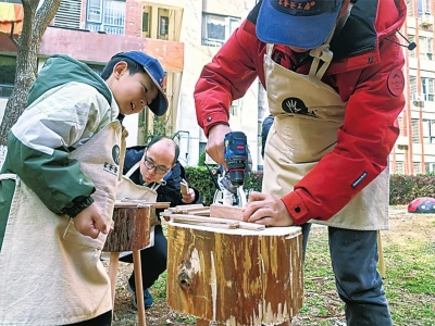 近日,武昌区南湖街道水域天际社区“益学营”户外阵地举办亲子木艺体验活动,通过诵读经典、讲解传统木艺文化、亲手制作小板凳等环节,让亲子家庭在动手协作中感受传统文化的魅力。