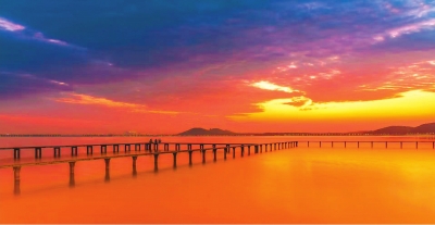 点评:取景以栈桥为视觉中心,展现自然与人文的和谐。光影处理绝佳:长曝光使湖面如绸缎,朝霞与远山冷暖碰撞,层次分明。作品通过朦胧人影与破晓光辉,传递静谧中的生命力,兼具东方美学意境与城市苏醒的隐喻。