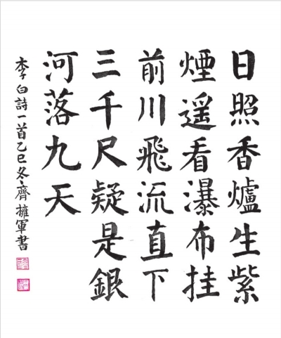 释文:日照香炉生紫烟,遥看瀑布挂前川。飞流直下三千尺,疑是银河落九天。