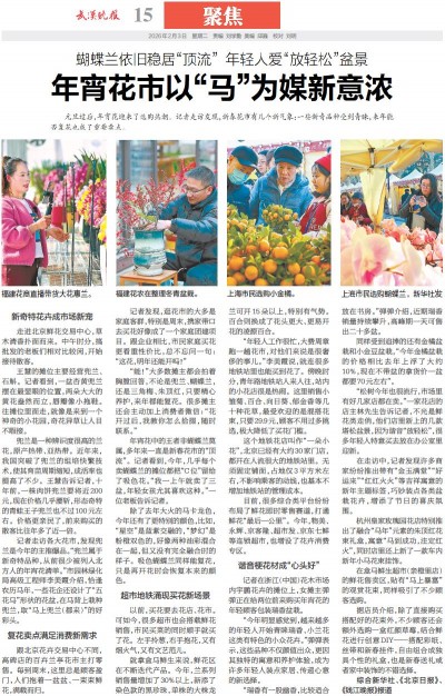 记者走访各大花市,发现兜兰是今年的主推爆品。“兜兰属于新奇特品种,从前很少被列入北方人的年宵花清单。”市园林绿化局高级工程师李美霞介绍,恰逢农历马年,一些花企还设计了“五花马”形状的花盆,在马背上栽种兜兰,取“马上兜兰(都来)”的好彩头。
