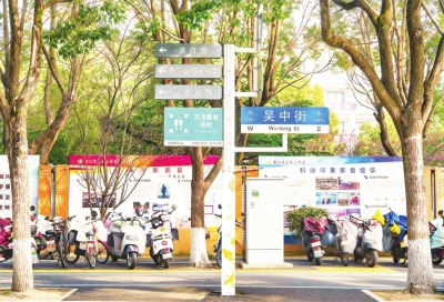 比如在山北路口,杆子上新增了前往吴家山公园、区中医院、区妇幼等地的方向指引;在吴家山中学门口,补充了吴家山小学、初级中学等周边学校的导引信息,同时将原有的禁停、限速等交通标识共享指示杆。一根杆子,从原本单一功能的“指示牌”变成了集导航指引、公共服务提示等于一体的多功能“服务杆”。这种“多杆合一”瘦身,不仅视觉上清爽开阔,更直接释放了人行空间,真正实现“还路于民”。