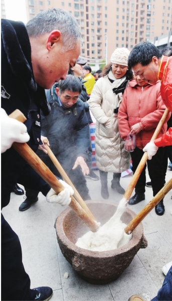 大家一起打糍粑。