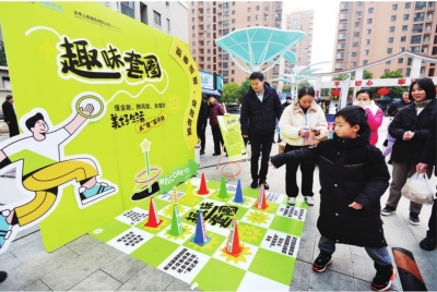 在趣味游艺区,设置了赛陀螺、投壶、掷钱祈福等传统游戏项目。社区工作人员身着汉服,热情地邀请和引导居民参与。大小朋友们玩得不亦乐乎。