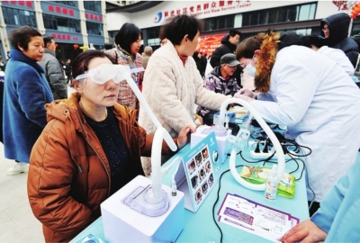 兴齐药业工作人员为居民进行眼部保健。