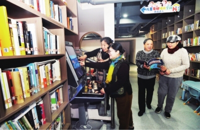 社区居民在常青图书馆社区分馆借阅书籍。