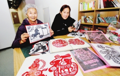 社区剪纸班的范熙慧和夏文丽老人在共享空间剪纸。