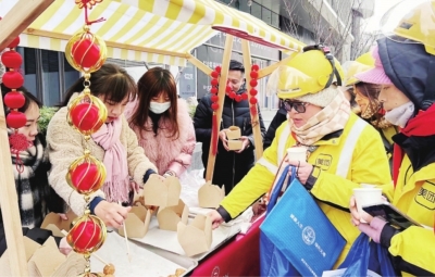 社区发动商家和志愿者为户外工作人群送温暖。