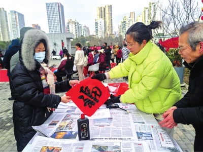 游园会现场,志愿者李文芳和刘永贵忙前忙后:这边帮老人扶稳桌角写春联,那边教小朋友拓印福字;非遗漆扇DIY摊前围满了年轻人,有人举着刚做好的漆扇拍照发朋友圈。免费理发、洗地垫、健康义诊等服务台前也排起了队。