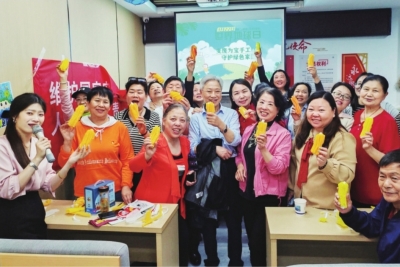 社区组织居民用废弃包装纸制作手工艺品。
