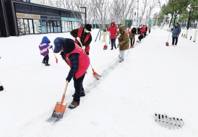 社区干部和志愿者清扫冰雪,确保居民安全出行。