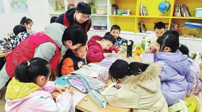 社区寒假爱心托管班上,大学生志愿者为小朋友辅导作业。
