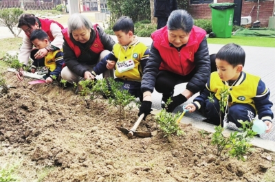 社区志愿者与幼儿园小朋友一起栽种绿植。