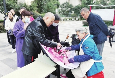 社区志愿者为居民朋友免费修理雨伞。