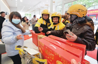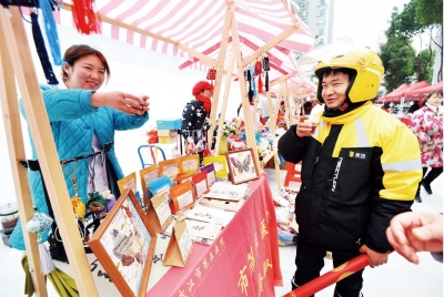 笔墨传福区内,七旬志愿者谭汉平和六旬志愿者徐志勇帮忙晾干新写的春联,书法老师正挥毫泼墨,为新就业群体定制专属春联。“他们平时为我们服务,今天轮到我们为他们服务了。”谭汉平说。据了解,全天发放近百副春联。