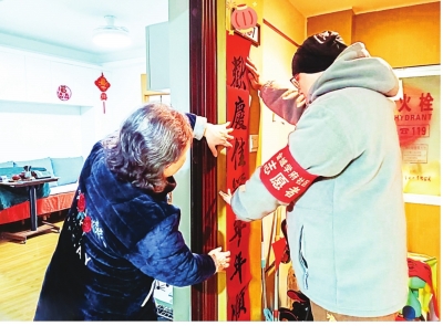 “送福小分队”上门为老人贴春联。