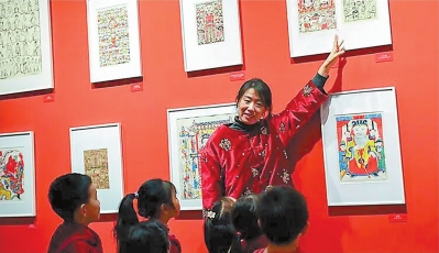 孩子们在武强年画博物馆观看《灶王爷》年画。