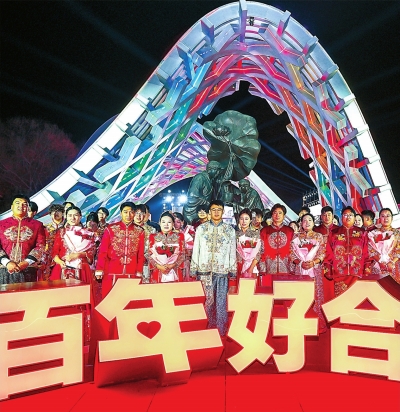 厚德·和合门前是大红色的“百年好合”立体大字,门下的路面上写着“这是我们开始的起点,一步相遇、两步相识、三步相知……”当晚10时30分许,一场传统婚礼仪式将浪漫氛围推向顶峰。26对夫妻或情侣携手登台,缓缓跨过象征百年好合的厚德·和合门,完成了别开生面的集体告白与纪念仪式。