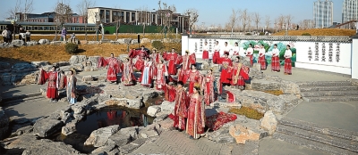 1月1日,邢台市百泉鸳水公园鸳鸯泉畔,8对新人参加中式集体婚礼。