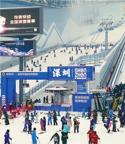 近日,滑雪爱好者在深圳·前海冰雪世界内滑雪。