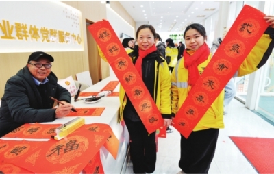 社区书法达人李德胜为外卖骑手写春联。