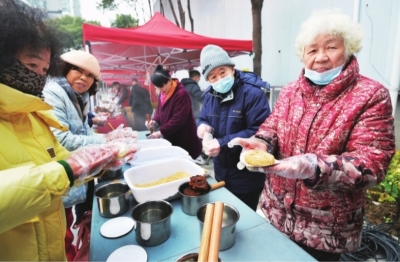 居民在社区组织下亲手制作糍粑。