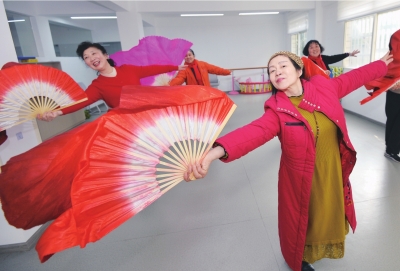 梦知舞蹈队的大妈们在社区共享空间习舞健身。