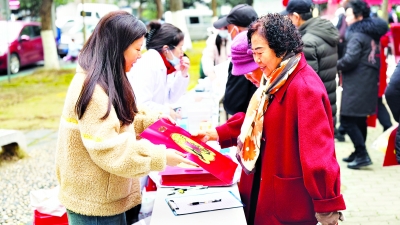 居民在家门口逛大集,领取福字和春联。