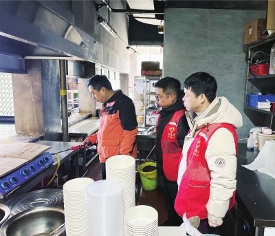 社区安全员和物业经理在商铺进行节前安全检查。